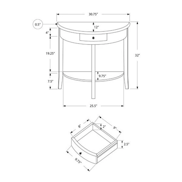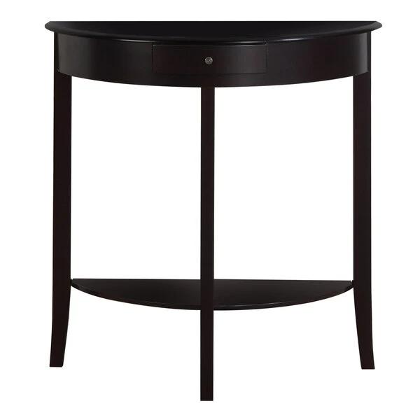 Designed with stylish simplicity, this traditional console table will be an effortless addition to your home decor. A dark cherry finish paired with a brushed silver drawer pull gives this classic Dem-ilune shape a fresh update. The storage drawer will help to keep you organized while the open bottom shelf provides additional storage space or surface space to display your favourite accents. Try adding a decorative basket to the lower shelf creating the ideal place to stow scarves, gloves or hats.. Classic Demi-lune shape in a warm dark cherry finish. Convenient storage drawer helps keep clutter contained. Brushed silver metal drawer pull. Open bottom shelf provides additional space for objects.