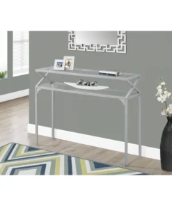 Grab your guests' attention with this stylish silver metal hall console table. Ideal for entryways, hallways this hall table will blend seamlessly with any decor. Featuring a unique two tiered open concept design, this fashion forward accent table is perfect for dressing up any wall in your home or office.. Two tier design in a contemporary style. Ample glass surface area for displaying your favourite decorative items. Versatile as a sofa or console table in your living room, hallway, entryway, or office space. .