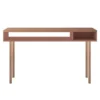 Complete your living space with this contemporary rectangular shape sofa console table. Finished in an alluring dark taupe wood-look and featuring a lower shelf that offers additional space for storage or display, this sofa/console table is the perfect addition to any home. A beautiful combination when you add the 3 piece matching occasional table set.. Finished in an elegant rich dark taupe wood-look. Open bottom shelf perfect for extra storage. Sturdy tapered legs. Great as a sofa or hall/entryway console table.