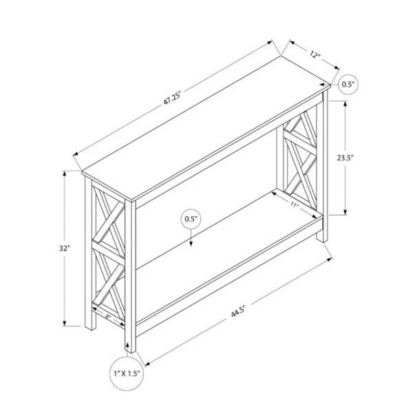 This transitional style hall console table is a great canvas to showcase your decorative flare. A rich and smooth, laminated dark taupe wood look finish on all sides, this rectangular accent table is joined with a thick X-frame at each end giving it a warm appeal. With an open bottom shelf for extra storage, this console table is versatile enough to bring into other spaces to display treasured photos and objects, books, or even as a place to set a tray of appetizers when entertaining. There are so many creative uses for this table and the long, narrow size makes it ideal for small spaces. Assembly is required.. Versatile rectangular entryway console table, with an attractive and sturdy X frame on each side for a warm, transitional appeal. Spacious rectangular tabletop and open bottom shelf is ideal for books, plants, decorative objects, or storage baskets. This long and narrow size accent table makes it a perfect space saver. Dark taupe wood-look finish on all sides easily blends with any decor.