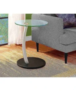 This contemporary style black and silver bentwood accent table is a convenient solution for placing snacks or drinks near your sofa or chair. A circular black base and stand offer sturdy support, while the 1/2 inch thick clear round tempered glass top has plenty of surface space for putting a cup of tea, snacks, or a tablet. This snack table is also ergonomically designed to gently curve forward so your drinks are within easy reach! Functional and stylish, this accent table is a must-have for any living room, family room, den, or office space. Easy to assemble and clean.. Contemporary style. Circular smooth black base with a curved silver arm offers sturdy support. Thick tempered glass top has plenty of surface space for drinks, snacks, or tablet. Practical accent table for a living room, family room, den, office, or bedroom.
