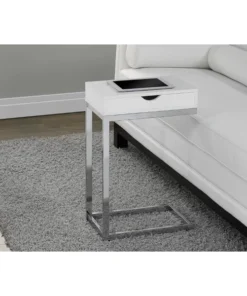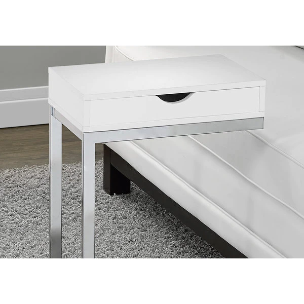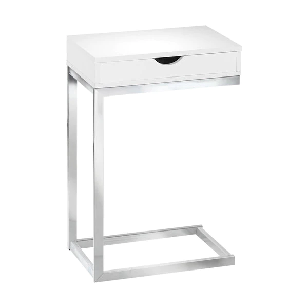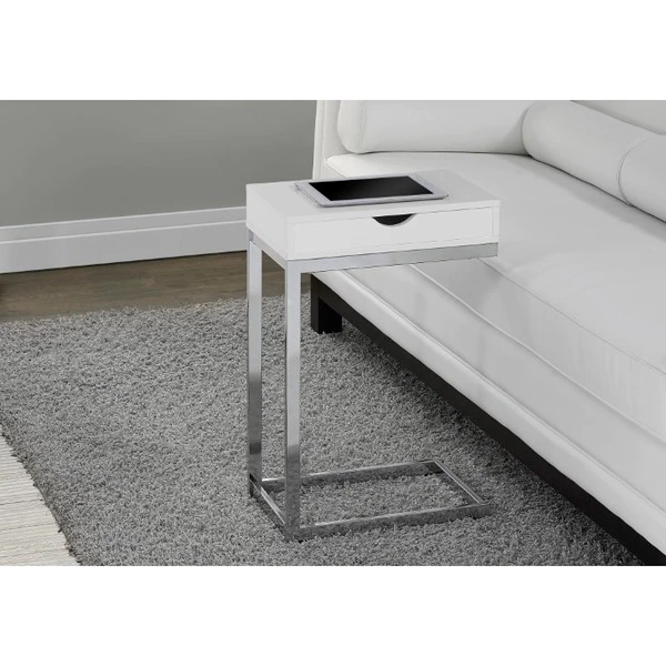 With a whole lot of snazziness, this modern C shape side and end table also comes with all the practicality you need. An ideal fit alongside your sofa or bed, the accent table is perfect for your small home, apartment or condo and will surely bring more jazz to your movie night, study session or quiet time. Featuring a glossy white finish, the sturdy chrome metal base sits slightly off the ground to prevent damage to your floor. Don't forget a convenient storage drawer for any living room accessories such as remotes, coasters, magazines or more. Make this your new favorite living room piece.. Boasting spiffy styling, its sturdy chrome metal base is as elegant as it gets. Thick panel finish in glossy white enhances the contemporary design of this C table. Snack table during your favorite movie or simply an accent table to dress up your living room decor. Includes storage drawer for remotes, coasters or other accessories.