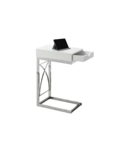 With a whole lot of snazziness, this modern C shape side and end table also comes with all the practicality you need. An ideal fit alongside your sofa or bed, the accent table is perfect for your small home, apartment or condo and will surely bring more jazz to your movie night, study session or quiet time. In a thick panel composition with a glossy white finish, there is no worry about blending this with your existing decor and furniture items. The table also features a sturdy chrome metal base. Don't forget the convenient storage drawer that opens from both sides to make this accent table perfect for remotes, coasters, magazines or more. Your new favorite living room piece – Assured.. Spiffy chrome metal base is as elegant and sturdy as it gets . Sleek, glossy white finish brings a contemporary design to this C shape side table . Try it as your living room snack table or simply an accent table to dress up your living room decor; it'll do wonders! . Includes storage drawer that opens on both sides for remotes, coasters or other accessories .