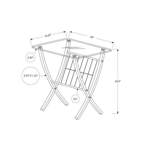 This contemporary accent table is not only stylish but also versatile. It features a rectangular tempered glass top with rounded corners and a convenient metal chrome rack for magazines or books. Stained in a rich espresso finish with unique crossing bentwood legs for sturdy support will suit almost any decor. This side table fits in perfectly in your living room, family room, bedroom, den, or office.. Includes a metal chrome rack ideal for storing magazines or books. Use as a side table to display a lamp, decorative objects. Versatile for any room with a contemporary/transitional style. Clear thick tempered glass (8mm) with a sophisticated bentwood base in a espresso finish.