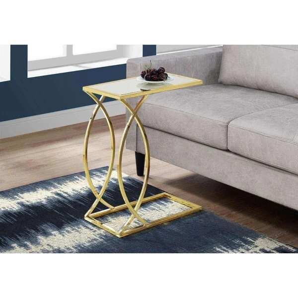 If you need a versatile and high functioning furniture piece, look no further than this contemporary style accent table. The spacious rectangular mirror top surface beautifully reflects any decorative accent piece, supported by gold metal legs that showcase intersecting circles in a stylish design. Slip the sturdy gold metal base under a sofa or arm chair and use it to put down your drinks and snacks or as a convenient place for your tablet or laptop within reach. You can also set it on the side as a handy end table next to a sofa, armchair, or a bed. Easy to move from room to room, you'll end up buying more than one! Assembly is required.. Spacious, glam mirror top surface. Stylish gold metal base for a modern, contemporary look. Versatile to use as a snack table or as an end table. Base easily slips under a sofa or armchair to keep everything within reach (.75 inches high).
