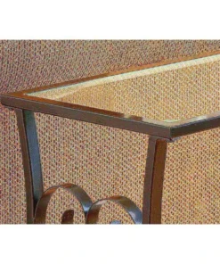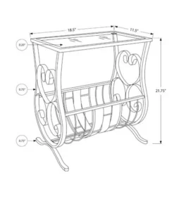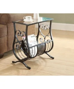 This elegant magazine end table is both stylish and multi-functional. It features an intricate weaved metal rack with curved bars to hold your magazines or books and a rectangular tempered glass top where you can place your coffee cup or a lamp as you read the latest novel. Finished in satin black, this charming accent table is a great addition to a living room, family room, den, or bedroom space.. Traditional styling with heart-shaped designs at each end in an elegant black finish. Spacious tempered glass rectangular top great for placing drinks, a lamp, or displaying favorite accents. Sturdy curved metal holder at the bottom is perfect for storing magazines and books. Multi-functional as an end or accent table in a living room, family room, or den.