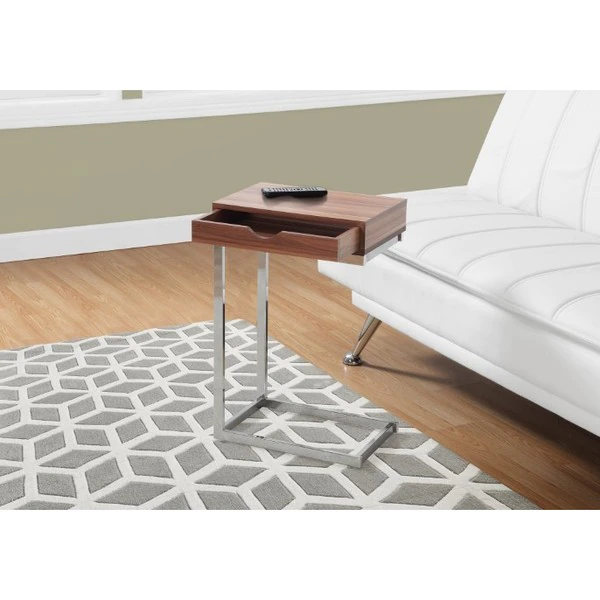 With a whole lot of classiness, this modern C shape side and end table also comes with all the practicality you need. An ideal fit alongside your sofa or bed, the accent table is perfect for your small home, apartment or condo and will surely bring more jazz to your movie night, study session or quiet time. Featuring a walnut wood look finish, the sturdy chrome metal base sits slightly off the ground to prevent damage to your floor. Don't forget a convenient storage drawer for any living room accessories such as remotes, coasters, magazines or more. Make this your new favorite living room piece.. Boasting spiffy styling, its sturdy chrome metal base is as elegant as it gets. Thick panel wood look finish in walnut brings a traditional touch to the contemporary design of this C table. Snack table during your favorite movie or simply an accent table to dress up your living room decor. Includes storage drawer for remotes, coasters or other accessories.