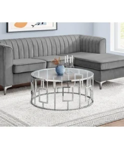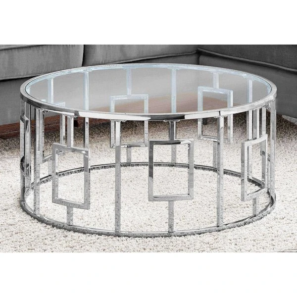 If you want a unique accent piece to anchor your living room, then look no further than this elegant round coffee table with a stunning drum shaped base in an open Greek key design. The spacious tempered glass top is large enough to place a decorative display or coffee table books, while the chrome finish on the sturdy metal base will bring that wow factor to your decor. The size is perfect even for small spaces, with its modern glam appeal. Assembly is required.. Contemporary style round metal coffee table with a glam vibe. Thick, clear tempered glass top with plenty of space to showcase books and decorative objects, or for a tray of appetizers when entertaining. Strong, round drum base with an open modern Greek key graphic design in a compact size cocktail table. Elegant chrome metal finish for an eye-catching appeal.