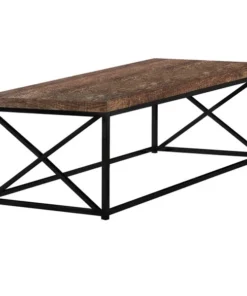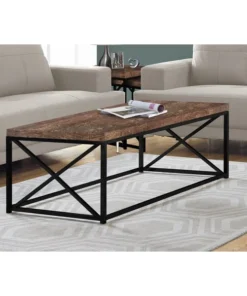 Inspired by clean lines and a simplistic, industrial feel, this brown reclaimed wood look and black metal coffee table offers a rustic style that will make you feel comfortable in your living room, office space or den. With the smoothest of thick panel surfaces, this piece warms up your living space, while the sturdy criss-cross black metal legs complement the table top. Add this stand-out center table to small home, condo or apartment's decor collection now!. This industrial coffee table for the living room consists of a rustic brown reclaimed wood look finish. Add its black metal criss-cross frame and you have a super-stylish center table that can handle your coffee, tea, books, laptop/tablet or any other decor items. Accent table that fits any space, including your living room, office or den. Thick panel, easy-to-clean table top.