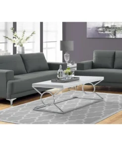 If you need a statement piece to anchor but not overwhelm your living room, then this coffee table with a contemporary twist will fit in nicely. The thick glossy white rectangular tabletop is spacious enough to rest a tray, hold some magazines or a decorative object. The chrome metal base with a unique circle intersected by an X leg design and solid base gives it a fashionable appeal. The classic lines of this coffee table will suit most decor styles. Assembly is required.. Thick and spacious glossy white table top. Solid chrome metal base with distinct circle and x-leg side supports for a stylish look. Contemporary design with a classic appeal. Statement worthy coffee table for a living room, family room, den, or office space.