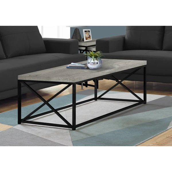 Inspired by clean lines and a simplistic, industrial feel, this grey reclaimed wood look and black metal coffee table offers a rustic style that will make you feel comfortable in your living room, office space or den. With the smoothest of thick panel surfaces, a wood-like texture warms up your living space, while the sturdy criss-cross black metal legs complement the table top. Add this stand-out center table to small home, condo or apartment's decor collection now!. This industrial coffee table for living room consists of a rustic grey reclaimed wood look finish. Add its black metal criss-cross frame and you have a super-stylish center table that can handle your coffee, tea, books, laptop/tablet or any other decor items. Accent table that fits any space, including your living room, office or den. Thick panel, easy-to-clean table top.