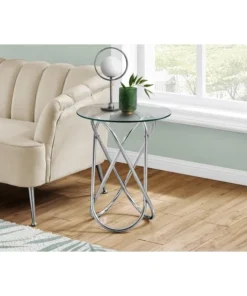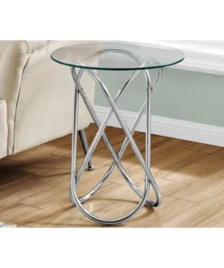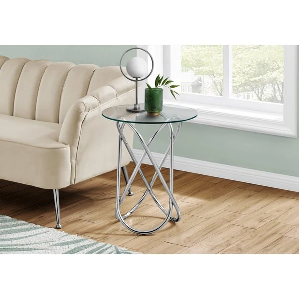 Designed with a modern twist, this chic accent table features a metal base with oval legs that intertwine for a distinctive look. The lustrous chrome finish of the base shines through the clear, tempered-glass tabletop. Beside a sofa or bed, this side table will add a touch of glam to a living room or bedroom.. Stylish 20-inch round accent table for living rooms or bedrooms. Tabletop made with clear, tempered glass. Metal base features 3 elongated, interlocking ovals in a chrome finish. Assembly required.