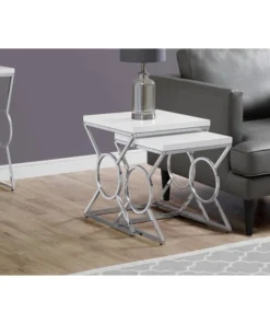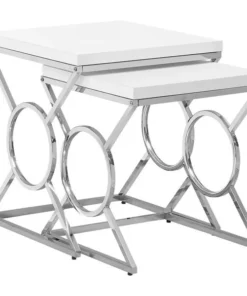 This set of 2 contemporary style nesting tables bring fashion and function to your living space. The thick glossy white square tabletop is spacious enough to hold a lamp, pictures, drinks or snacks. The chrome metal base with a unique circle intersected by an X leg design gives a statement appeal while providing solid support. This multi-functional table set is neatly stored one under the other for a space saving solution, and can be used as end tables or simply pulled out as snack tables when entertaining. The classic lines of these nesting tables will suit most decors. Assembly is required.. Set of 2 square nesting tables. Thick and spacious glossy white laminated table tops. Solid chrome metal base with distinct circle and x-leg side supports for a stylish look. Contemporary design with a classic appeal.