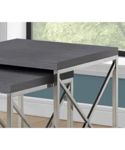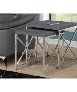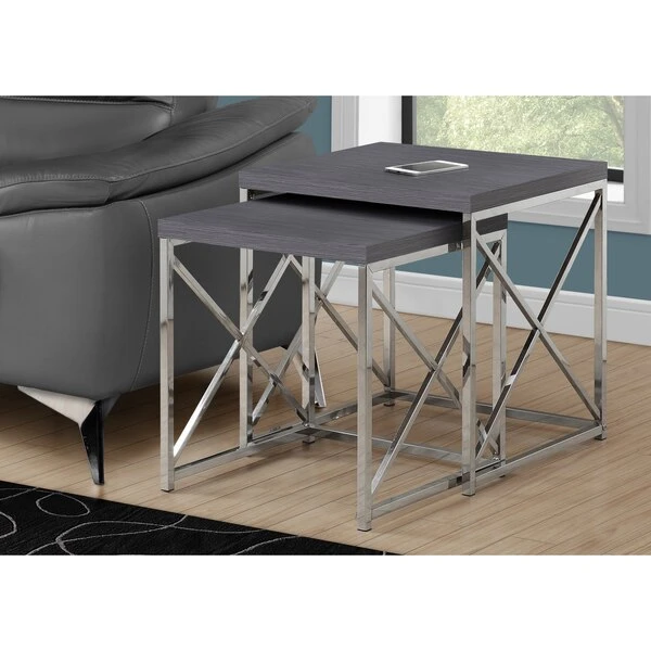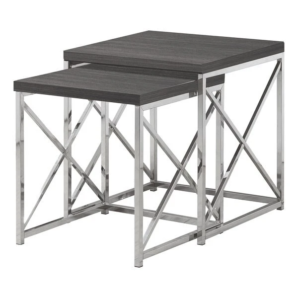 This set of 2 nesting end tables bring a warm welcome to you and your guests with its thick table tops in a grey finish supported by elegant chrome metal bases in a sturdy X-design. Multi-functional for display or storage, these accent side tables can be slid together or used separately and they are the perfect size for your apartment, condo or small home thanks to the space-saving stacking design. They will surely modernize any room, entryway, office or bedroom.. 2-piece set includes larger accent table and small end table; both multi-functional as lamp tables, display tables. Draw attention with this stylish nesting coffee table set in a grey wood-look finish for your living room. Sturdy, these chrome metal framed stacking tables will be perfect in small homes, apartments or condos. Finished on all sides for placement just about anywhere in the room.