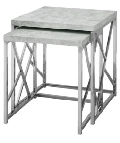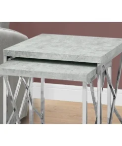 With a chic cement look surface and a stylish thick paneled design, this 2 piece square nesting table set gives an exceptional look to any room. The original criss-cross chrome metal base provides sturdy support as well as a clean contemporary look. Use this multi-functional set as end tables, lamp tables, decorative display tables, or simply as accent pieces for any living space.. Set of 2 different sized nesting tables in a chic modern design. Smooth grey cement-look spacious table tops. Contemporary chrome metal base for strong support. Versatile use as end tables or accent tables in a livingroom, family room, office space.