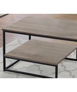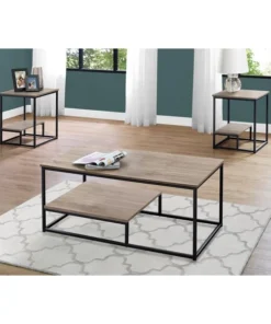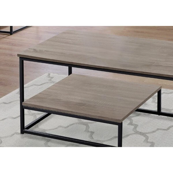 Bring a fresh modern update to your living space with this unique 3 piece coffee table set. The simple contemporary design in a warm dark taupe laminated wood-look finish and accented with a black metal trim, provides a spacious table top with a raised bottom half shelf for additional storage and display. The matching end tables are perfect to place a lamp, pictures, or other decorative objects while the coffee table will be an attractive focal point in your living room, den, or family room.. 3 piece table set includes a coffee table with two matching end tables. Spacious table tops in a warm dark taupe wood-look finish. Raised bottom half shelf for additional storage. Unique contemporary design with black metal accents.