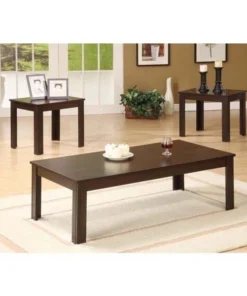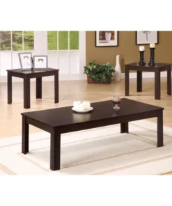 Simple, straight and sturdy legs, contemporary style wood look finish in dark-brown espresso, this living room table set features a rectangular coffee table and two end tables to complete the collection. A sleek look fills your living room with a cool, modern feel. The square and rectangular shapes will be easy to place anywhere in your small home, condo or apartment.. Includes one coffee table and two end tables. 3-piece coffee table set finished in dark-brown espresso to add a contemporary touch to your living room, family room, or even home office. Simple and sturdy open block-style legs. This coffee table set for your living room is perfect for photo frames, vases, a lamp or any other decorative object.