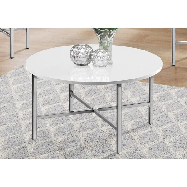 Refresh your living room with this stylish and contemporary 3 piece round table set that will add polish to your space. The clean lines of this set include a coffee table with a spacious glossy white surface to showcase an artful arrangement, place some books or magazines, or to set down a tray of snacks when entertaining. The matching end tables can hold a lamp with space to put down your drink. The tables are supported with a sleek cross metal base in a lustrous chrome finish for a nice, simple overall design. This table set fits perfectly in a small living room, family room, or office area without crowding a space or sacrificing style. Assembly is required.. Contemporary style 3 piece set that includes a round coffee table with two matching end tables. Sleek and spacious glossy white laminate tops with a simple, polished chrome cross metal base for sturdy support. An ideal size coffee table set for a small living room, family room, or office area with its clean line design and chic style. Product dimensions: 35.5 Inch L x 35.5 Inch W x 18.75 Inch H; 22 Inch L x 22 Inch W x 24 Inch H.
