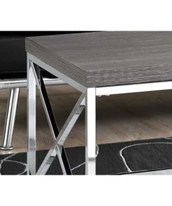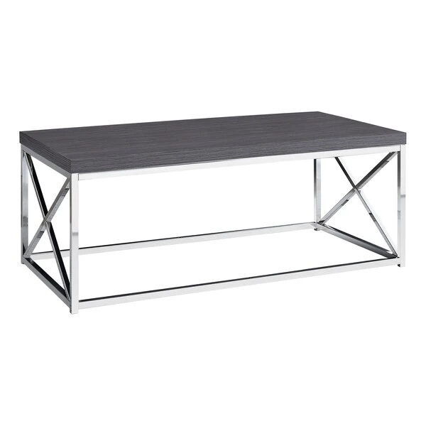 Inspired by clean lines and a simplistic, yet modern feel, this grey wood look and chrome metal coffee table offers a contemporary allure that will make you feel comfortable in your living room, office space or den. With the smoothest of thick panel surfaces, its grey finish warms up your living space, while the criss-cross chrome metal legs are both sturdy and shiny to complement the table top. Add this stand-out center table to small home, condo or apartment's decor collection now!. This contemporary coffee table for living room consists of a grey wood look finish. Add its bright chrome metal criss-cross frame and you have a super-stylish center table that can handle your coffee, tea, books, laptop/tablet or any other decor items. The perfect accent table for any room, including your living room, office space or den. Thick panel, easy-to-clean table top.