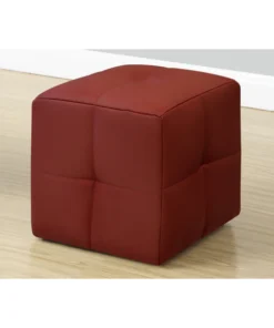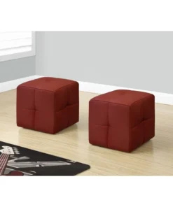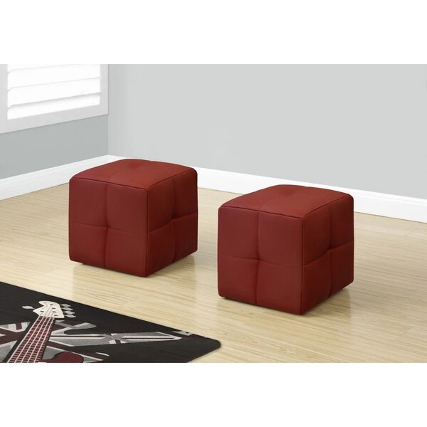 Kids love blocks, so they'll adore these cube-shaped poufs. Sold as a set of 2, these ottomans have a whimsical style that's perfect for a child's bedroom or playroom. The top and all 4 sides are padded and upholstered in a smooth, red leather-look fabric. Biscuit tufting creates a series of soft-to-the-touch squares for enhanced comfort. Versatile and lightweight, this pair of kids' ottomans is ideal as extra seats or footrests in a living room or bedroom and can be moved around as needed.. Set of 2 kids' ottomans in a fun cube shape and upholstered in a red leather-look fabric. Biscuit tufted and comfortably padded on all sides. Small poufs look like contemporary furniture for grownups but are sized specifically for children. No assembly required. Product dimensions: 12 inches L x 12 inches W x 12 inches H each