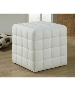 Enjoy style and comfort right out of the box with this cube-shaped ottoman. Padded and upholstered all around in a white leather-look fabric, this pouf features biscuit tufting on the top and all 4 sides which creates a pattern of small squares mimicking its boxy silhouette. The geometric shape of this versatile pouf will add a fun, contemporary touch to a family room, living room, or bedroom. It's ideal as a footrest in front of a comfy chair or as a convenient surface to place a tablet or book. Plus, this portable foot stool is compact and lightweight enough to easily move from room to room if you need an extra seat when entertaining guests.. Cube-shaped ottoman with a wooden frame and upholstered in a white leather-look fabric. Biscuit tufted and padded on all sides for enhanced comfort. Designed for multiple uses as a foot stool or an impromptu side table in a living room or bedroom, or as a pouf wherever an extra seat is needed. No assembly required. Product dimensions: 16.75 inches L x 16.75 inches W x 17 inches H