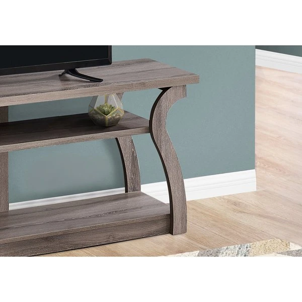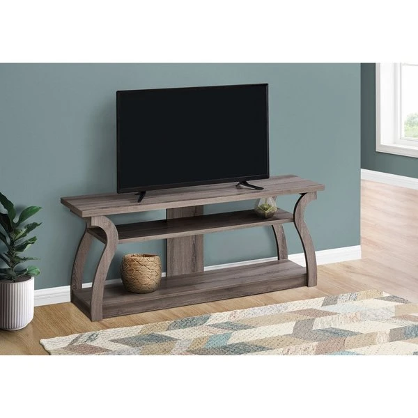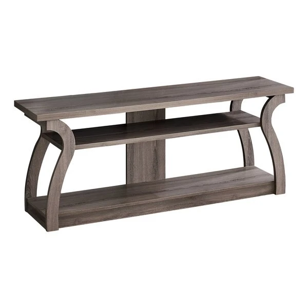 If you want to proudly display your electronics instead of hiding them in enclosed cubbies or behind cabinet doors, here is a TV stand that gives them the space and attention they deserve. It has a 3-tier, open-concept design and accommodates most TVs when centered on the spacious top shelf. The middle and bottom shelves offer additional storage space to conveniently arrange other components for a well-equipped entertainment center. This media console in a dark taupe wood-look finish features unique, curved sides and a space-saving, narrow profile that is great for a living room or bedroom in an apartment, condo, or small home.