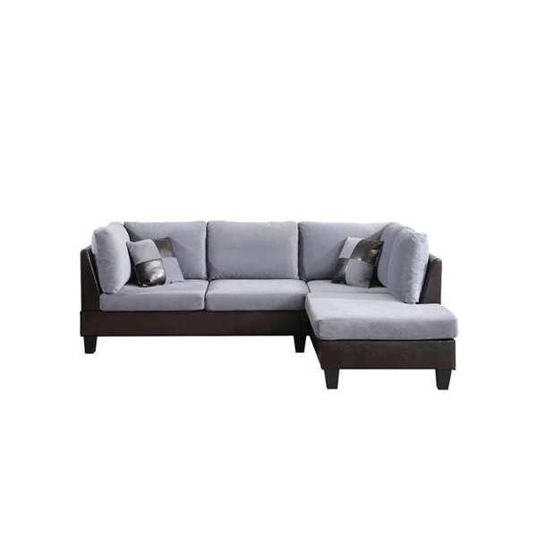 This sectional is wrapped with high quality champion fabric and packed with custom seating setup options. The chaise lounge is reversible and can be structured on the left or right side. Throw pillows are included. FeaturesHigh quality champion fabricMulti configuration setupOptional lift top ottoman with storageThrow pillows includedComfort focusedParts stored underneath sofa/chaiseSpecificationsColor: GrayMaterial: WoodOrientation: ReversibleShape: SpecialtyStyle: TransitionalCushion Material: FoamFrame Material: WoodSofa Shape: L ShapedUpholstery Material: MicrofiberNumber of Seat: 3Seat Dimension: 29"Dimension: 69 x 99 x 34 in.Weight: 191.8 lbs