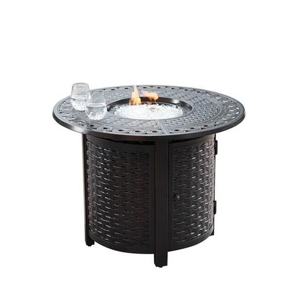 Bring the warmth and ambiance of a round 34 inch aluminum fire table to your patio. deck or backyard. Featuring a stylish clean aluminum antique copper finish. this fire pit is complete with a durable solid aluminum design base. making it an attractive centerpiece for your outdoor living space. Complete with a 25.000 BTU stainless steel burner and integrated ignition. you can enjoy all the ambiance of a classic fire without the mess or danger of tending ashes. This unit also comes with clear fire glass. a table lid. propane tank cover and a protective table fabric cover. SpecificationsFinish: Antique CopperOutdoor Material: AluminumShape: RoundTable Dimension: 34" L x 34" W x 24.5" HWeight: 65 lbs