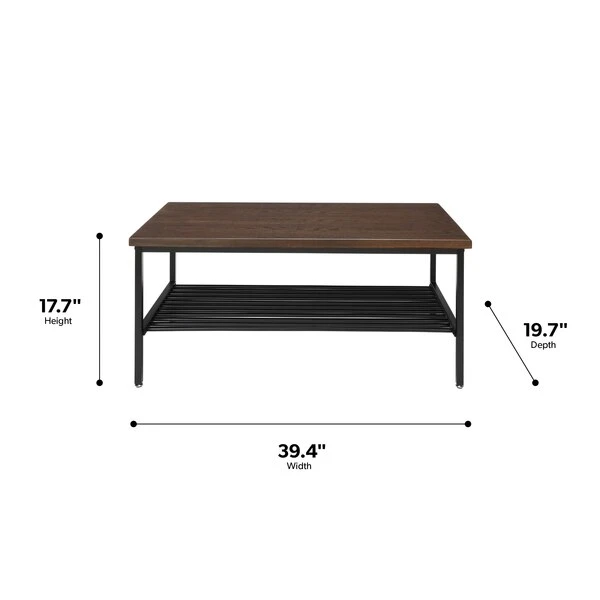 The 161 Collection blends mid century modern and industrial modern styles with current design trends to create timeless pieces that will seamlessly complement any decor. The OFM 161 Collection Industrial Modern Wood Top/Metal Frame Coffee Table with Metal Shelf blends easily in living rooms, recreational spaces, lobbies, and reception areas and provides the perfect place to rest your coffee cup. The richness of the Walnut tabletop finish pairs perfectly with the strong matte Black metal frame for the perfect industrial modern touch to any room. A convenient metal rung shelf sits beneath the tabletop, waiting to store miscellaneous items as needed. Assembly for this coffee table is quick and easy and the materials used make cleaning simple. The table features adjustable leveling floor glides to help account for uneven flooring. The coffee table measures 39.4" D x 19.7" W x 17.7" H, holds up to 200 lb of weight, has a full BIFMA rating, and is backed by our 5 Year Limited Warranty.