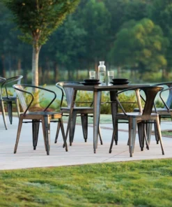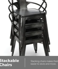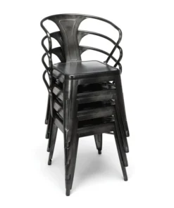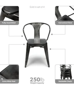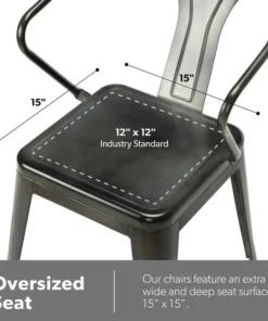 The 161 Collection blends mid century modern and industrial modern styles with current design trends to create timeless pieces that will seamlessly complement any decor. The OFM 161 Collection Industrial Modern 18" Mid Back Metal Dining Chairs with Arms, 4 Pack, are manufactured with galvanized steel for indoor and outdoor use. These stacking metal chairs come fully assembled and are welded together for added strength. The use of anti-UV powder to prevent heat retention make these dining chairs a great solution for outdoor spaces like cafes, bistros, pubs, or your own backyard. The mid back arm chairs feature extra wide seats, an x-brace beneath the seat that provides additional support and stability, measure 22.5" D x 20.0" W x 30.9" H, and hold at least 250 lb of weight. The metal surface makes cleaning easy and the plastic non-marring protective floor glides help prevent sliding and scratching. These chairs have been tested to light commercial-grade standards. With our 5 Year Limited Warranty, these patio chairs bring substance and style to any space.