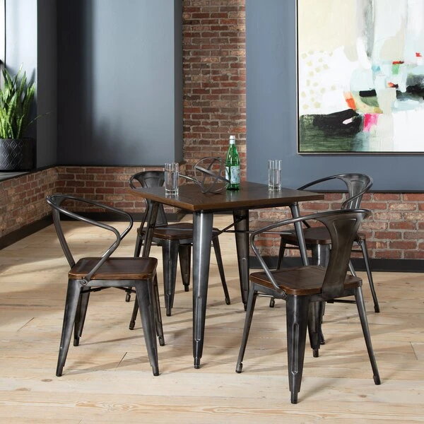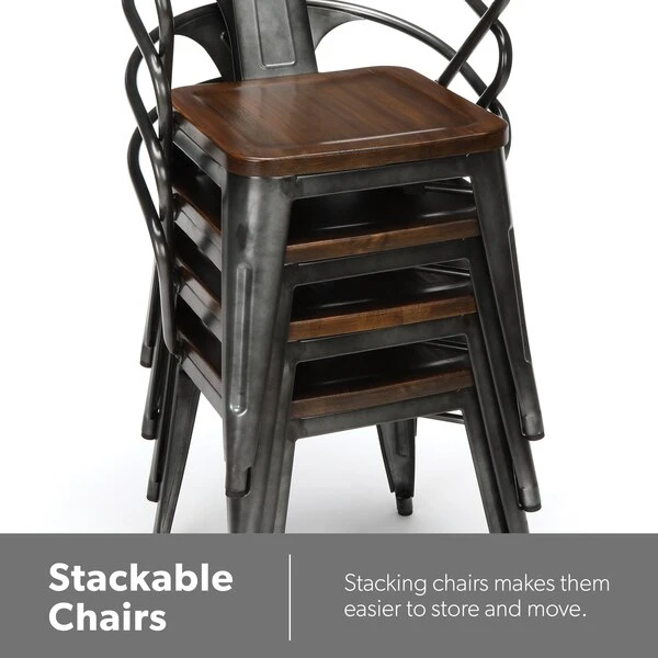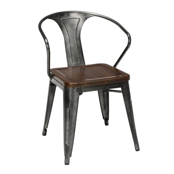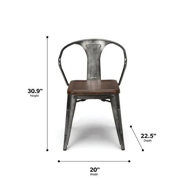 The 161 Collection blends mid century modern and industrial modern styles with current design trends to create timeless pieces that will seamlessly complement any decor. The OFM 161 Collection Industrial Modern 18" Mid Back Metal Dining Chairs with Arms and Solid Ash Wood Seats, 4 Pack, feature galvanized steel chair frames with solid ash wood seats, marrying the industrial with the modern. These stacking metal chairs come fully assembled and are welded together for added strength. The arm chairs feature an anti-UV powder to prevent heat retention, making these dining chairs a great solution for covered outdoor spaces like restaurants, cafes, bistros, pubs, or your own backyard. The mid back arm chairs feature extra wide seats, an x-brace beneath the seat that provides additional support and stability, measure 22.5" D x 20.0" W x 30.9" H, and hold at least 250 lb of weight. The metal and wood surfaces make cleaning easy and the plastic non-marring protective floor glides help prevent sliding and scratching. These chairs have been tested to light commercial-grade standards. With our 5 Year Limited Warranty, these dining chairs bring substance and style to any space.