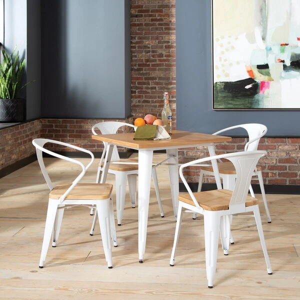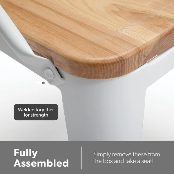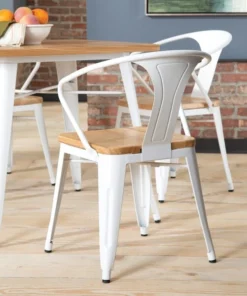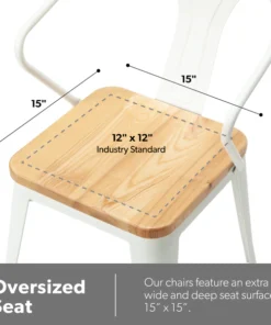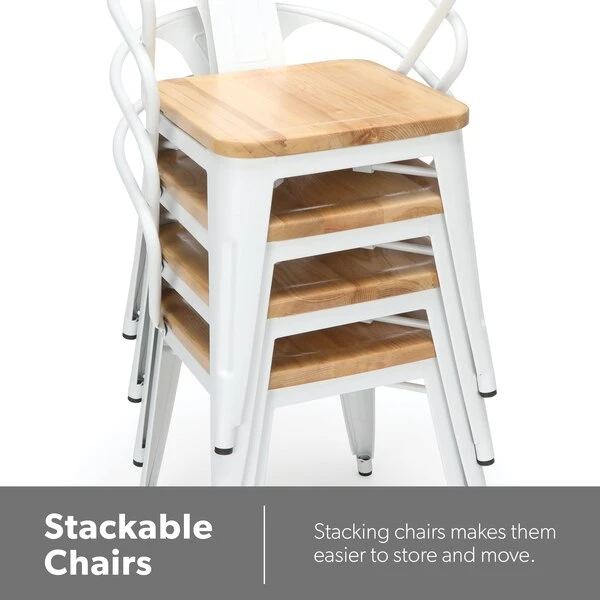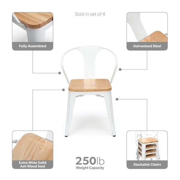 The 161 Collection blends mid century modern and industrial modern styles with current design trends to create timeless pieces that will seamlessly complement any decor. The OFM 161 Collection Industrial Modern 18" Mid Back Metal Dining Chairs with Arms and Solid Ash Wood Seats, 4 Pack, feature galvanized steel chair frames with solid ash wood seats, marrying the industrial with the modern. These stacking metal chairs come fully assembled and are welded together for added strength. The arm chairs feature an anti-UV powder to prevent heat retention, making these dining chairs a great solution for covered outdoor spaces like restaurants, cafes, bistros, pubs, or your own backyard. The mid back arm chairs feature extra wide seats, an x-brace beneath the seat that provides additional support and stability, measure 22.5" D x 20.0" W x 30.9" H, and hold at least 250 lb of weight. The metal and wood surfaces make cleaning easy and the plastic non-marring protective floor glides help prevent sliding and scratching. These chairs have been tested to light commercial-grade standards. With our 5 Year Limited Warranty, these dining chairs bring substance and style to any space.