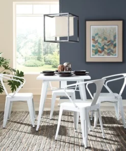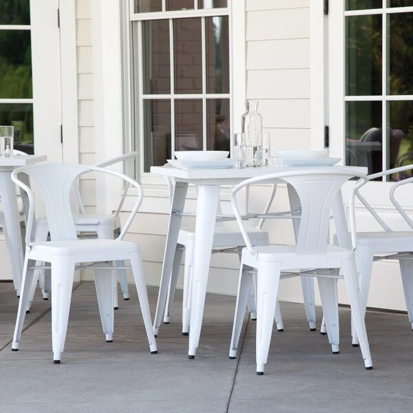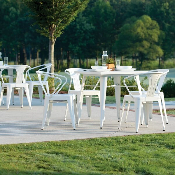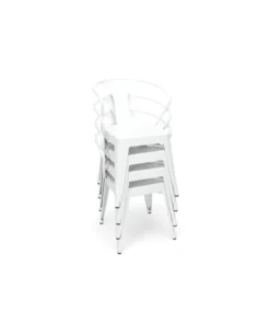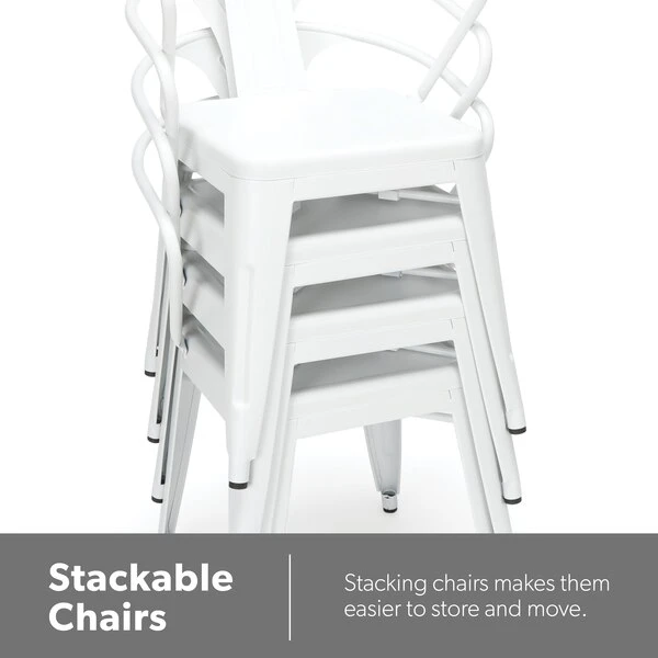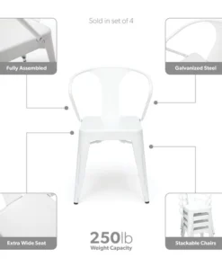 The 161 Collection blends mid century modern and industrial modern styles with current design trends to create timeless pieces that will seamlessly complement any decor. The OFM 161 Collection Industrial Modern 18" Mid Back Metal Dining Chairs with Arms, 4 Pack, are manufactured with galvanized steel for indoor and outdoor use. These stacking metal chairs come fully assembled and are welded together for added strength. The use of anti-UV powder to prevent heat retention make these dining chairs a great solution for outdoor spaces like cafes, bistros, pubs, or your own backyard. The mid back arm chairs feature extra wide seats, an x-brace beneath the seat that provides additional support and stability, measure 22.5" D x 20.0" W x 30.9" H, and hold at least 250 lb of weight. The metal surface makes cleaning easy and the plastic non-marring protective floor glides help prevent sliding and scratching. These chairs have been tested to light commercial-grade standards. With our 5 Year Limited Warranty, these patio chairs bring substance and style to any space.