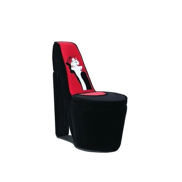 Glamor Girl Black & Red High Heel Storage Chair This elegant Glamor Girl Storage High Heel Chair will fit perfectly in any living room style and decor. The back rest of this chair is made for comfortable resting while performing leisure activities. like watching television or reading a book. With the conveniently hidden storage space making this chair quite practical for discretely storing books. magazines. and other objects. The framework of the chair is made of solid wood accompanied with faux suede on the outside for sturdiness and comfort. The weight capacity for each chair is 300lbs. One can place this chair for a modern home decor or separately. FeaturesThe height of the seat from the floor is 17" HThe length from the backseat to the front of the seat is 18" HFully AssembledSpecificationsColor: Black & RedSize: 32.86 in.Backrest Measure: 21" HHidden Storage Dimesion: 13.5" L x 13" W x 14" HThe Dimension of the Heel Space: 10" x 22"x 24"Weight: 31 lbs