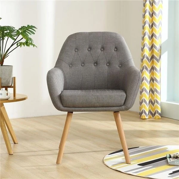 This barrel chair is found atop four beech wood legs. Wraparound back and foam-filled seat for extra comfort. it features button tufting. It will add cozy touch to your living space. FeaturesUpholstered dining chair with bucket seatDiamond-pattern tufting with covered buttonsThick padded cushion for extra comfortSplayed Beech legs in wood finishSpecificationsColor: GrayBack Height: 18.5 in.Seat Height: 19 in.Back Dimension: 18.5 x 18.5 in.Overall Dimension: 36.5 x 18.5 x 17 in.Seat Dimension: 18.5 x 17.0 in.Weight: 20.9 lbs