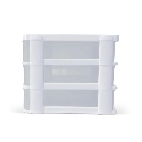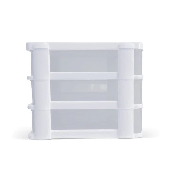 3-Drawer storage cabinet by MQ® is finished in Clear Polypropylene (PP) resin material with a white frame. This storage cabinet includes 3 drawers with a capacity xx liters (xx.x quarts) each and is adorned with brush steel simulated resin handles. This cabinet is sturdy and the drawers can be completely removed for easy cleaning.