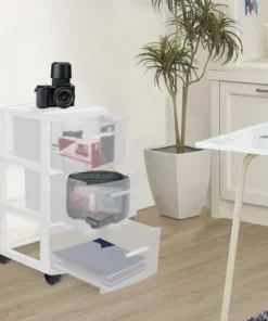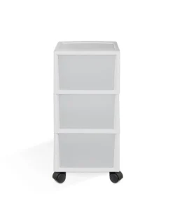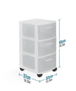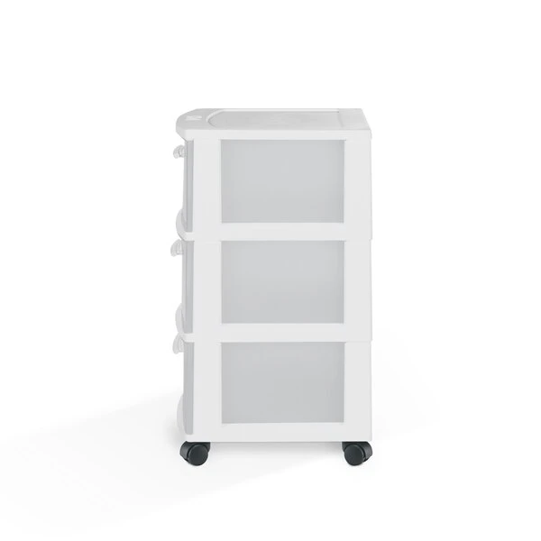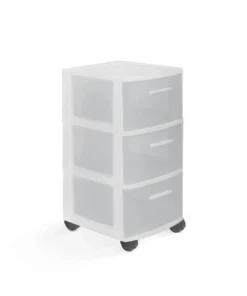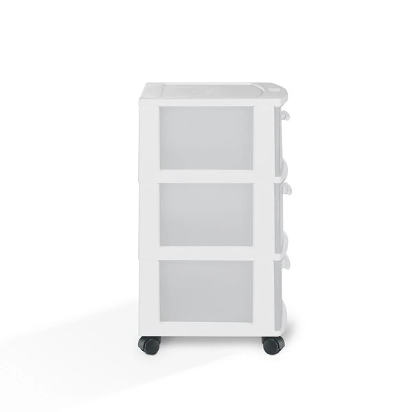 3-Drawer storage cabinet by MQ® is finished in Clear Polypropylene (PP) resin material with a white frame. This storage cabinet includes 3 drawers with a capacity 12 liters (12.7 quarts) each and is adorned with brush steel simulated resin handles and casters. This cabinet is sturdy and the drawers can be completely removed for easy cleaning