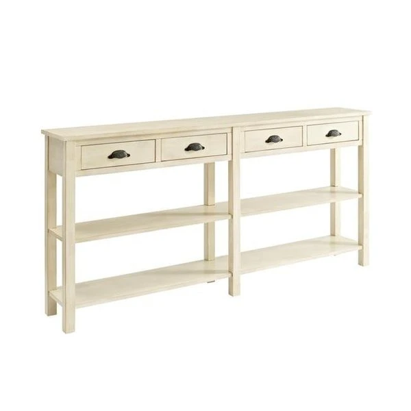 Highlight any space with a Farmhouse style extended Console Table for a light. airy look. Features an antique Cream crackle finish. cast antique bronze drawer pulls. and generous shelf space for display or storage. Simple charm won't overshadow your precious items.Dimensions; 72"x 12"x 34.5"Tall