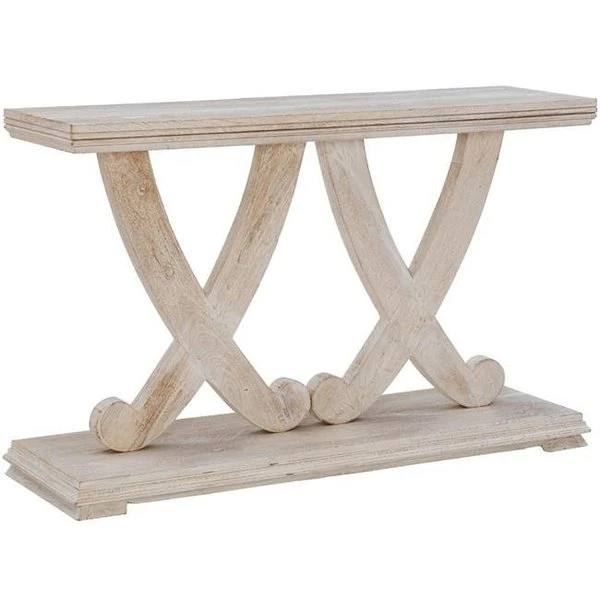 Made from solid mango wood. this console table has a neutral white finish that makes it easy to dress up or down. An artistic piece that much needed functionality. this console can do everything from displaying decor pieces to helping tidy clutter. The tabletop has plenty of room for a pair of your favorite lamps. stacks of your beloved books and a basket to help keep keys and mail organized. This console is a great addition to any living room. office. bedroom. entry way and more. FeaturesNeutral whitewashed color matches any decorSolid mango wood constructionGenerously sized tabletop can hold lamps. books. photos and moreMultipurpose design can be used in any roomSpecificationsColor: WhitewashedFinish: Mango WoodDimension: 48 x 14 x 30 in.Country of Origin: IndiaWeight: 60.64 lbs