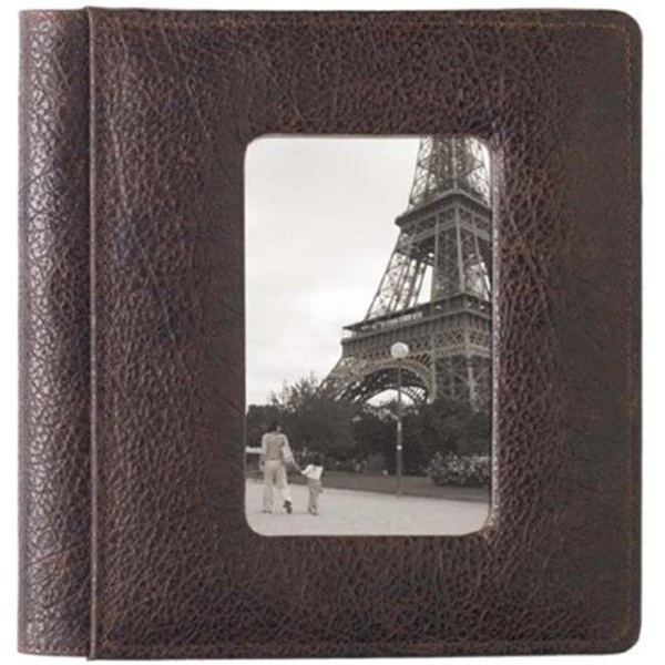 Cover measures 8'' x 9.25'' and has a framed opening to hold a 4'' x 6'' photo. Twenty-five linen pattern mounted cover weight pages and 25 parchment-like sheets. Interior is moire lined and has covered expandable screw posts for additional pa