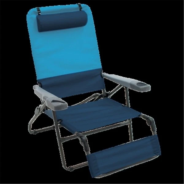 This chair is perfect for lounging outside in your backyard or while camping. This 4-position lounger with fold-out ottoman has a dark powder coated aluminum frame. extra wide seat and pillow headrest. The ottoman lounger has wide molded arms with angled slot for a cell phone. a beverage holder. and a bottle opener integrated into the arm rest. The padded shoulder strap makes it easy to transport to outdoor events. Features4-position lounger with fold-out ottomanDark powder coated steel frame for corrosion resistanceWide arms with angled slot for a cell phone. a beverage holderCarry strapsA bottle opener integrated into the arm restSpecificationsColor: BlueSky & NavyWeight Capacity: 300 lbsSeat Height: 13.75 in.Weight: 20.24 lbs