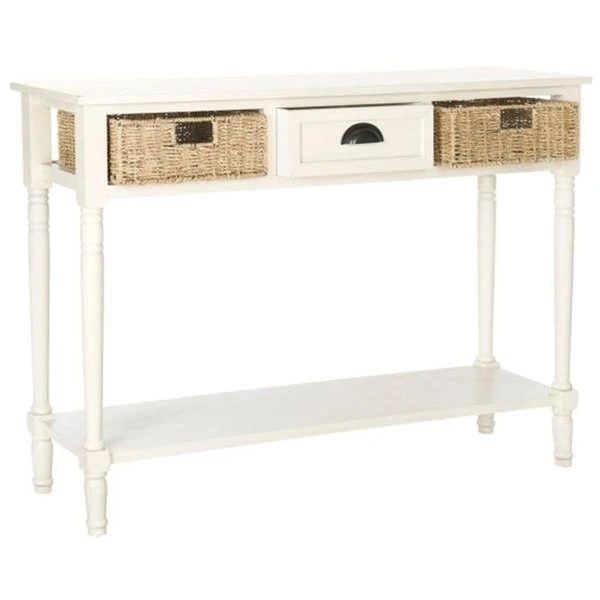 In the past few decades Safavieh has come a long way with sophisticated operations. We've always been conside on fine quality. craftsmanship and style. We have continued to meet the unique needs of our clientele by providing only the highest quality product. It is always our pleasure to serve you. Our services are tailo to earn your trust and loyalty. Our products are tailo to earn your trust and loyalty. Country chic styling makes the Winf console a welcoming statement piece for an entry hall. Crafted of pine in a painted finish. this hardworking console has a lower shelf and rattan drawers flanking a wood-faced drawer with half-moon pull. SpecificationsColor: WhiteWood Color: WhiteWood Content: Pine +; Mdf W/wood VeneerCollection Name: SafaviehAssembly Required: YesDimensions: 32" H x 14" W x 44" DWeight: 30 lbs