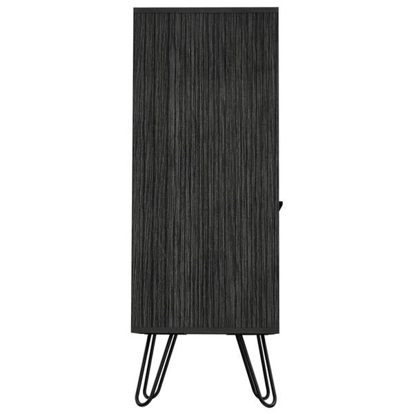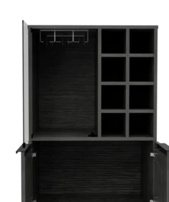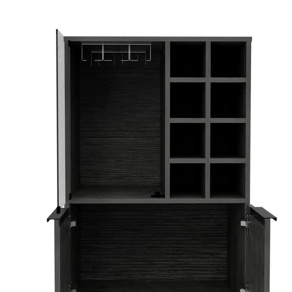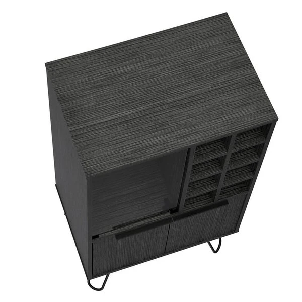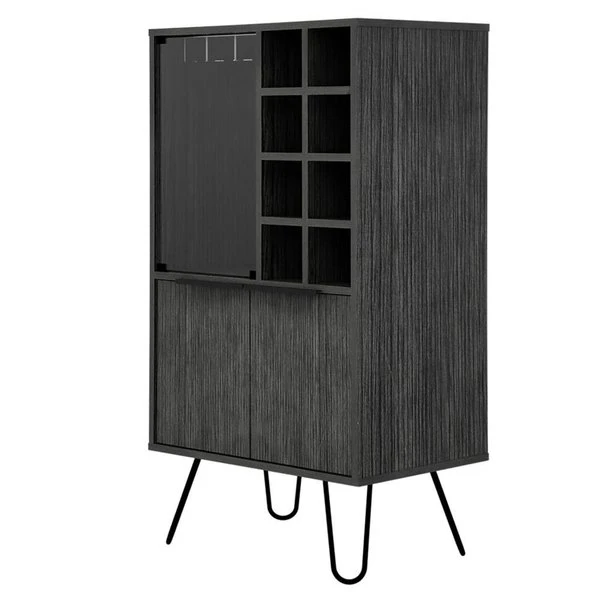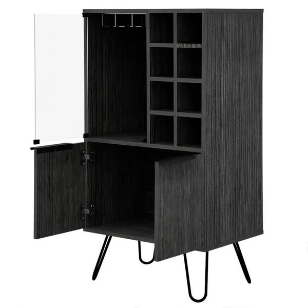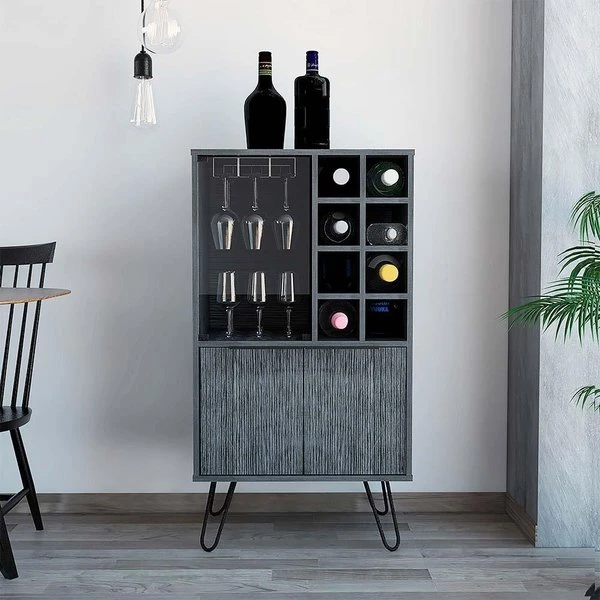 A handsome, compact bar cabinet that can hold your favorite wines and liquors, complete with a glass door compartment to hang your wine glasses. Gray accents on the bottom doors swing on nickel-plated hinges, standing on curved steel legs to give a mid-century new modern feel. Carefully designed with style and affordability in mind, the Aster Bar Cabinet is a fine selection to beautify your space.