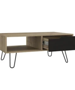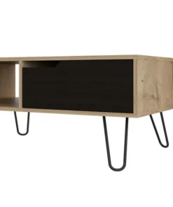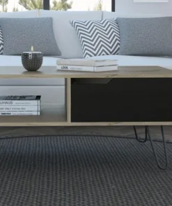 A charming coffee table with a touch of asymmetry, standing on curved steel hairpin legs with adequate storage for coasters and magazines. This piece emphasizes smart horizontal lines to center your space and includes lots of surface area where you can have your morning cup of joe or a movie night with all your friends. Available in a calming light natural wood finish with a coffee-colored door accent for a distinctive look that can compliment a variety of living areas.