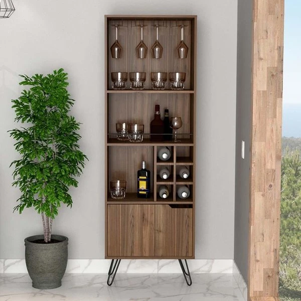Find storage for your favorite glasses, wines, and liquors in a stylish upright cabinet that stands on modern steel hairpin legs. This cabinet has more than enough storage for everything you need to share a drink with a friend or to host a whole gathering. This carefully designed piece features clean lines for a mid-century modern feel that is both reliable and affordable.