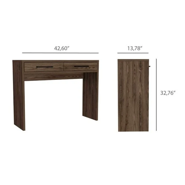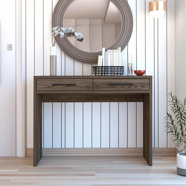 Transform a spare room into a home office or an elegate and existing setup with this sleek, symmetrical console table. Designed with two deep drawers for storage, the clean lines and elegant wood hues make this piece a staple of excellence. Easy to wipe clean from spills or accidents, this piece is perfect for a family-friendly product that doesn't sacrifice a sleek look.