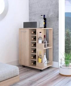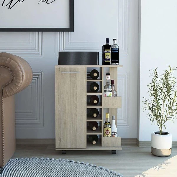 This simple bar cabinet is the perfect accessory to mix and mingle in your home. Sporting nine storage compartments for liquors, spirits, and wines, plus a useful surface up top, making this bar is the perfect centerpiece for any engagement. This piece boasts a comfortable, modern design on freestanding wheels, ready to go wherever's clever.