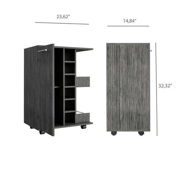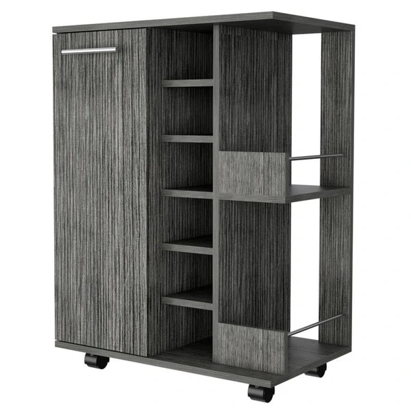 This simple bar cabinet is the perfect accessory to mix and mingle in your home. Sporting nine storage compartments for liquors, spirits, and wines, plus a useful surface up top, making this bar is the perfect centerpiece for any engagement. This piece boasts a comfortable, modern design on freestanding wheels, ready to go wherever's clever.