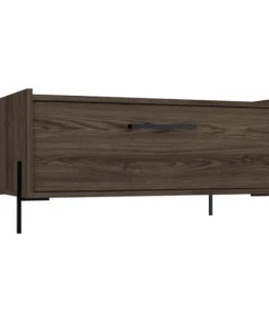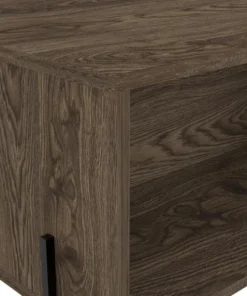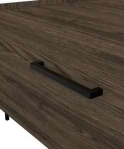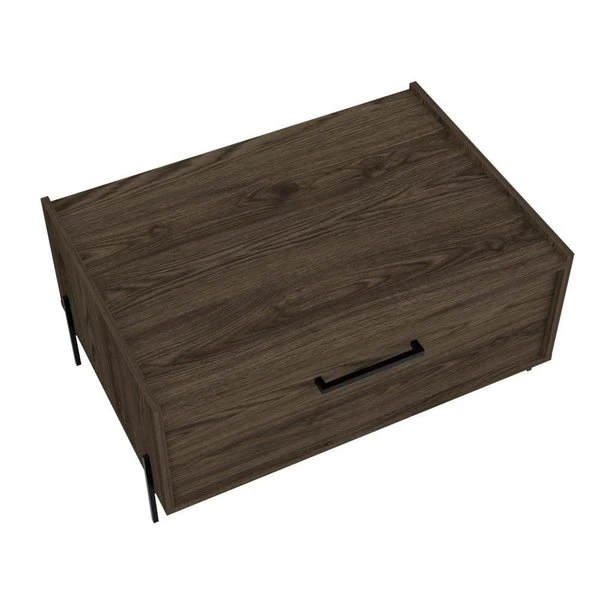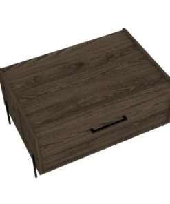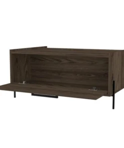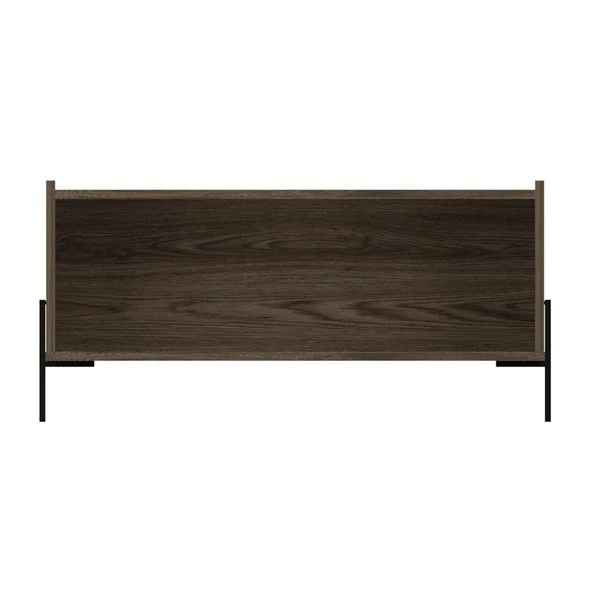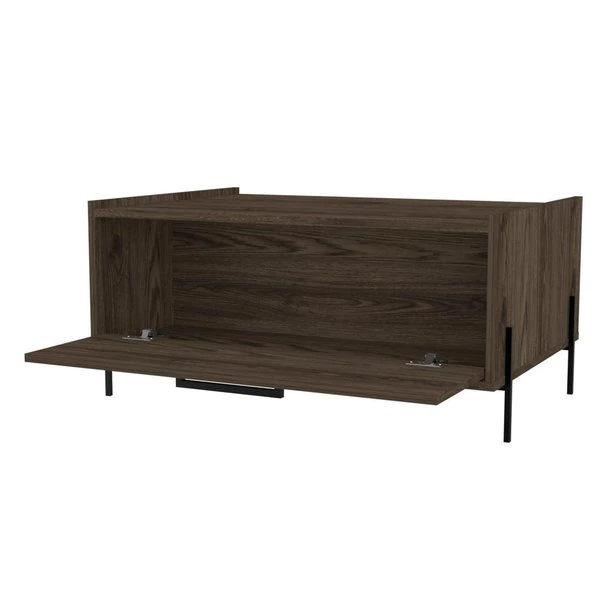 This Page coffee table is the height of minimalist sensibilities, standing on steel legs that frame the shape of the table for added stability and charm. The symmetrical design and large door reveal enough storage space for all your favorite board games, blankets, coasters, or anything else you may need in a pinch. This piece is finished in a rich wood color and carefully constructed with high-grade wood laminate for a smart look that is effortless to maintain.