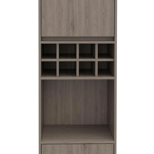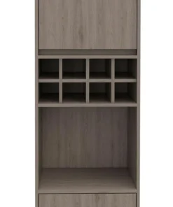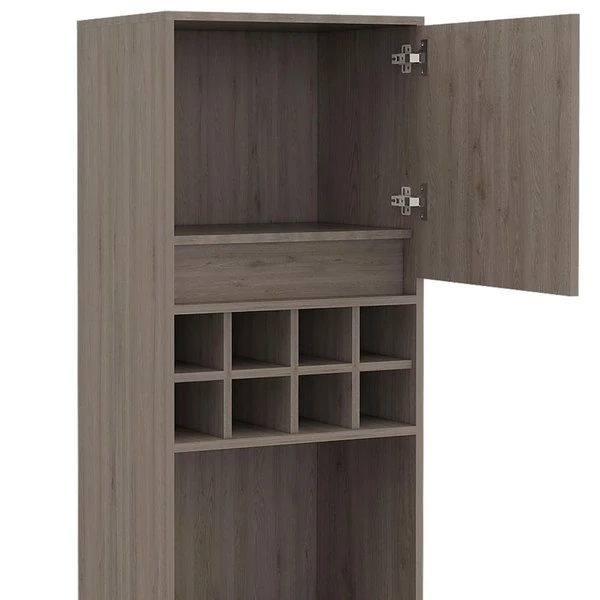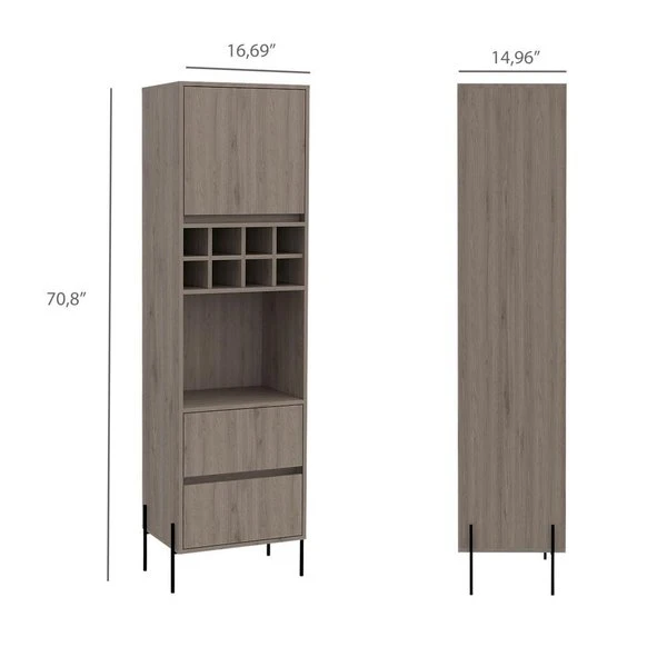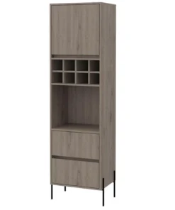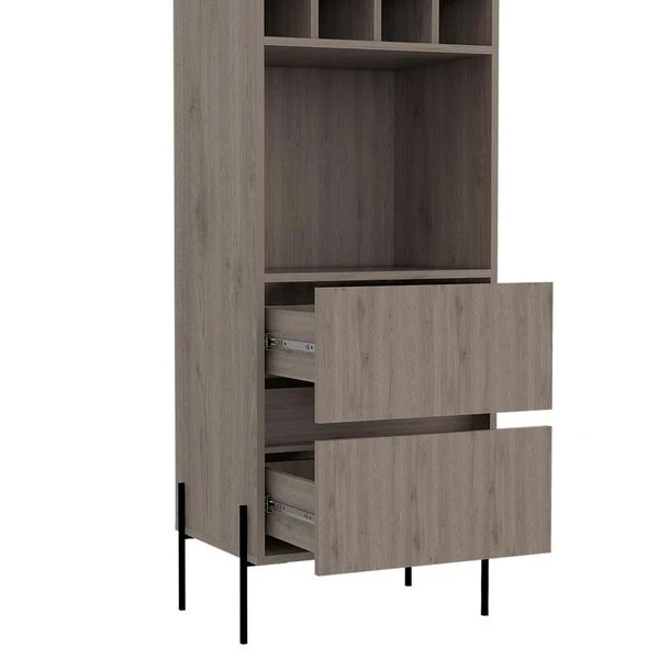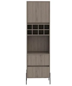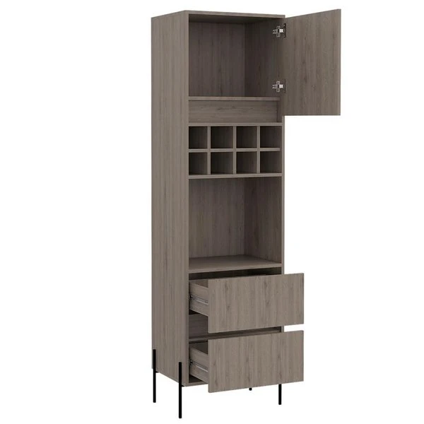 Keep your party space clear and organized and have fun doing it. This towering bar cabinet features a modern design with natural elements for an elegant and durable addition to your interior space. A combination of pull-out drawers, exposed shelving, and bottle compartments offer a wide variety of storage solutions.
